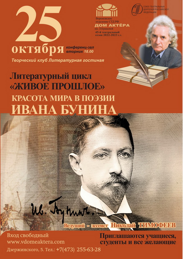 А 25 октября, во вторник, в литературно-театральном цикле «Живое прошлое» планируется встреча с Поэзией. Тема: «Красота мира в Поэзии Ивана Бунина». Прозвучат фрагменты радиоспектакля «Русская любовь во Франции, или Париж, Жанетт и Бельведер» в исполнении артистов Кольцовского театра. В том числе романсы на стихи Поэта в исполнении актрисы Виктории Стеганцевой. В ноябре в этом же цикле планируется вечер «Поэзия. Глоток свободы. Конец 1960-х», в котором будут представлены стихотворения известных воронежских поэтов.