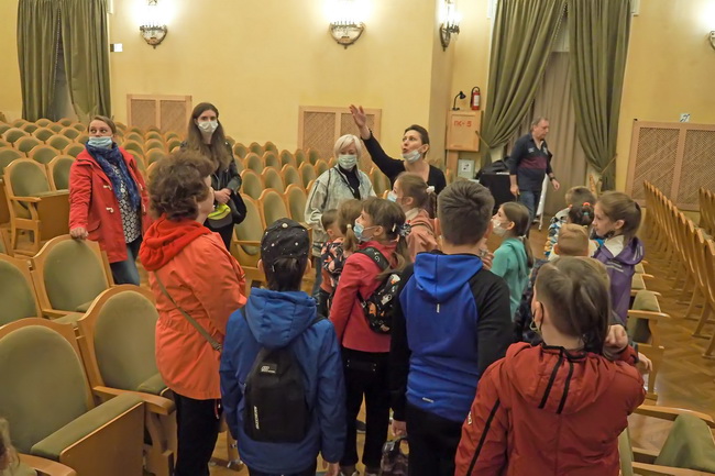 После концерта юные зрители совершили небольшую прогулку по филармонии, увидели сцену, познакомились с портретами композиторов-классиков, украшающих стены концертного зала.