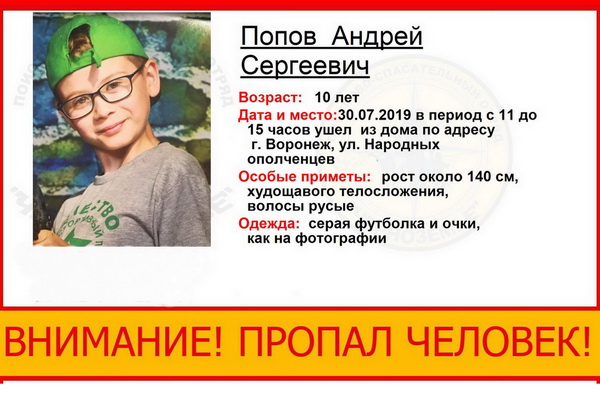 30 июля около двух часов дня ушёл из дома десятилетний Андрей Попов. В 21:00 час в дежурную часть отдела полиции № 8 УМВД России по городу Воронежу (Ленинский район) поступило сообщение от 49-летней местной жительницы об исчезновении ребёнка.