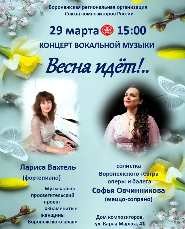 Концерт «Весна идёт!..» состоится 29 марта в 15:00 в Каминном зале Дома композиторов в рамках музыкально-просветительского проекта «Знаменитые женщины Воронежского края».