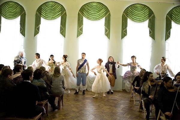 Воронежский спектакль был бы уместен и во дворце где-нибудь в центре Европы, и в богатой усадьбе какого-нибудь русского барина. А сыграли его в одном из залов областного художественного музея имени Ивана Крамского. Постановщики умело использовали то обстоятельство, что зал имеет три выхода. Каждый из них задействован максимально. Персонажи свободно перемещаются по авансцене, покидают ее и появляются снова – уже с другой стороны зала. Впрочем, говорить об авансцене всерьез не приходится. Действие разворачивается в метре от зрителей. Было бы непростительным упущением не обыграть это обстоятельство. И вот Орландо (Алексей Тюхин) доверяет зрительницам первого ряда немного подержать свою шпагу. А в сцене сумасшествия того и гляди упадет на кого-нибудь или проткнет шпагой. Разумеется, это только прием, но весьма эффектный.