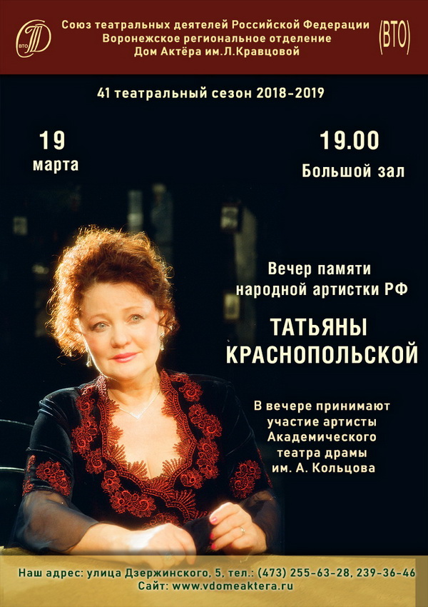 19 марта в Большом зале Дома актёра им. Л. Кравцовой состоится вечер памяти народной артистки России Татьяны Краснопольской. Ведущая актриса Кольцовского театра внесла большой вклад в театральное искусство.