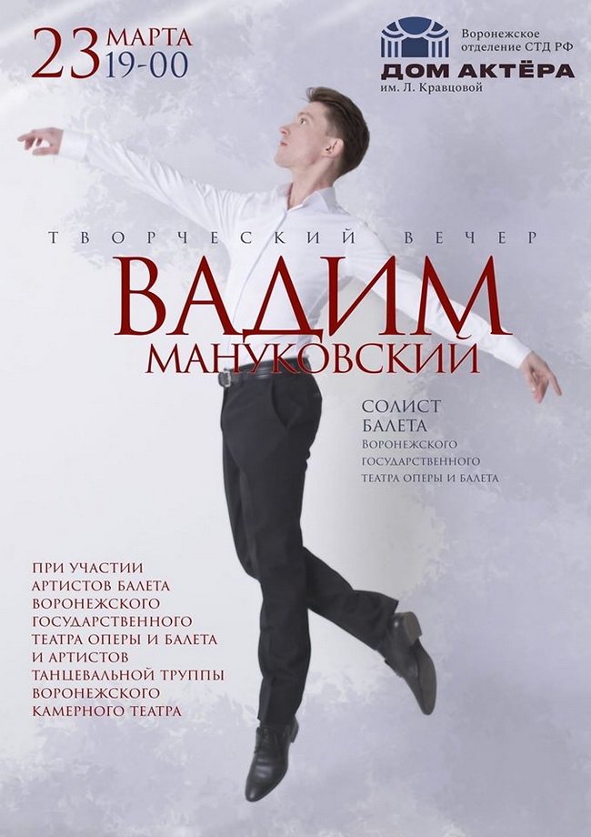 23 марта на сцене Большого зала Дома Актёра им. Людмилы Кравцовой состоится творческий вечер ведущего солиста балетной труппы Воронежского театра оперы и балета Вадима Мануковского. Начало в 19:00.