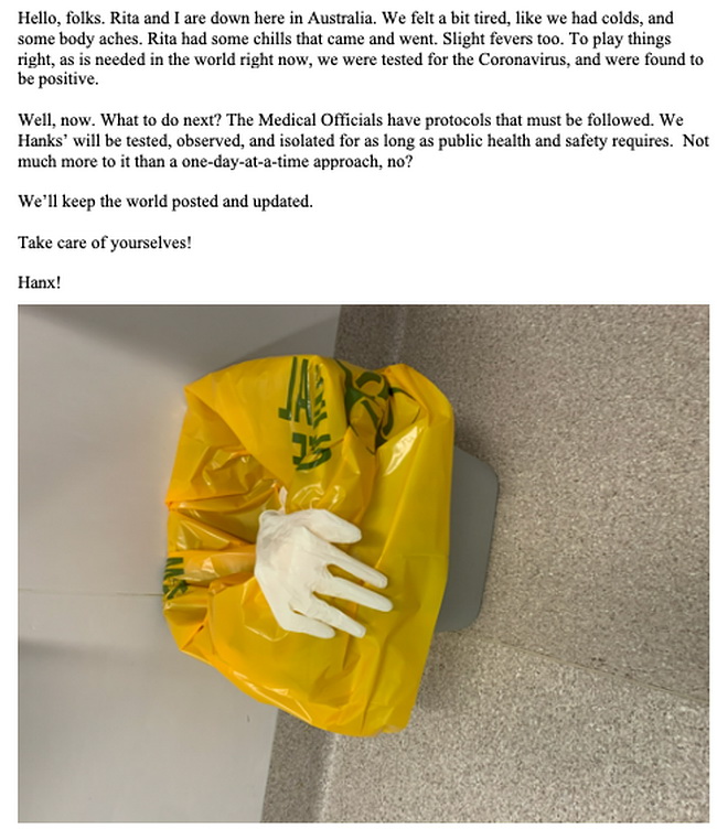 Проблема в том, что оба супруга много контактировали в последние дни, вели активную творческую жизнью. Власти Австралии опасаются, что вирус может поразить большое количество людей. Съёмки фильма уже остановлены, концерты Риты Уилсон отменены.
