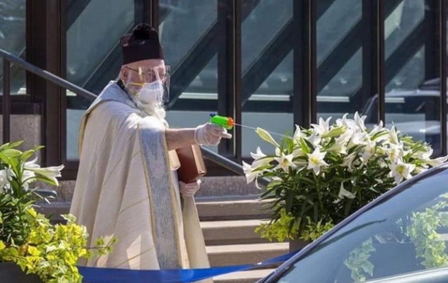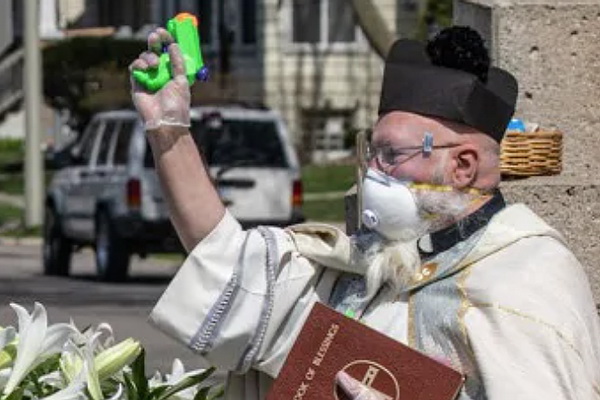 Преподобный Тим Пелк из американского штата Мичиган попал в заголовки новостей за юмористический способ окропления верующих святой водой. Святой отец, соблюдающий все предписания властей о социальном дистанцировании, придумал, как хитро обойти запрет.