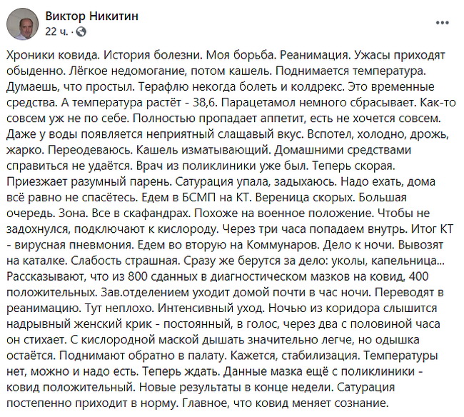 На 60-м году жизни скончался от коронавируса воронежский писатель, руководитель отдела прозы литературно-художественного журнала «Подъём» Виктор Никитин. Почти до самой роковой черты он делился с подписчиками подробностями борьбы с Covid-19.