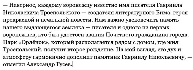 Областными и городскими властями принято принципиальное решение об установке в Воронеже памятника известному писателю Гавриилу Троепольскому (1905—1995). С просьбой рассмотреть возможность установки памятника автору «Белого Бима» к губернатору Александру Гусеву обратился председатель Союза писателей России Николай Иванов. Глава региона эту идею поддержал.