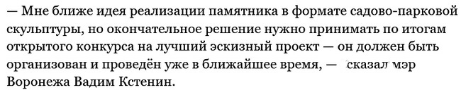 Теперь предстоит организовать и провести конкурс на лучший эскизный проект памятника. Сроки поджимают. Фигура писателя должна занять своё место до сентября. Торжественное открытие состоится в день города. Финансироваться работы будут за счёт бюджета города Воронежа.