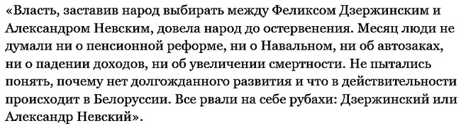 В конце статьи он объясняет, почему нельзя было навязывать людям выбор между Дзержинским и Александром Невским. Вместо примирения – раскол и взаимная ненависть. Нуждается ли сегодня в этом страна?