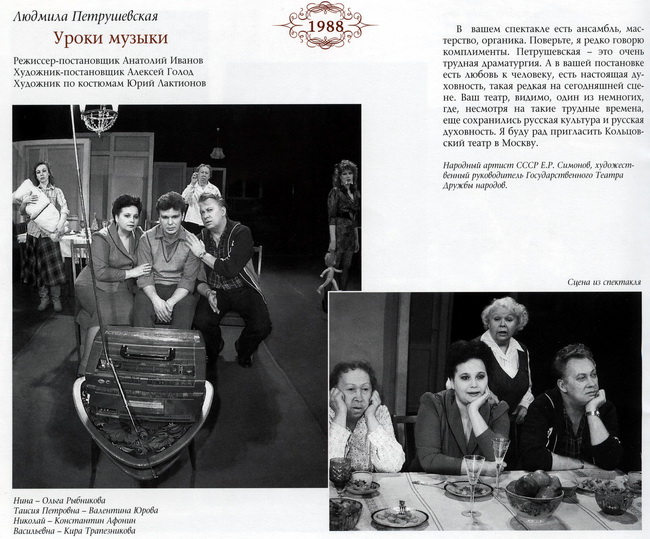 С приходом в 1987 году в Кольцовский театр Анатолия Иванова для Валентины Юровой возникла возможность расширить и углубить творческий диапазон. Очень важна была и для театра, и для нового главного режиссёра, и для нашей актрисы – постановка в самый что ни на есть перестроечный период пьесы «Уроки музыки» (1988) драматурга Людмилы Петрушевской, не очень-то жалуемой официальными властями. И роль Таисии Петровны, матери непростого семейства, требовала не просто одноплановой характерности, а глубокой психологической проработки. От того, насколько сложный, живой и реалистический характер удастся воплотить исполнительнице этой роли, практически зависел успех всего спектакля. И актриса вполне справилась с режиссёрской задачей. Перед зрителем возникла современная женщина, весьма практичная, понятная в своих нуждах и переживаниях за благополучие семьи и своих близких.