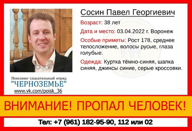 Родственники артиста Воронежского театра оперы и балета и Воронежской филармонии Павла Сосина обратились к поисковым отрядам «Лиза Алерт» и «Черноземье» с просьбой найти пропавшего мужчину.