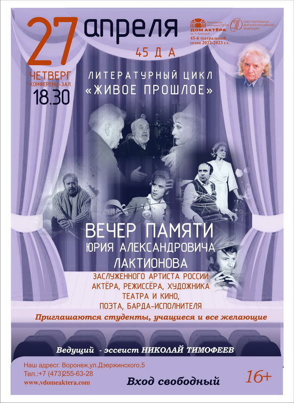 Критик, эссеист Николай Тимофеев вспоминает о яркой и не до конца оценённой фигуре – актёре, музыканте, поэте, художнике Юрии Лактионове. Творческая встреча в Доме актёра в цикле «Живое прошлое» 27 апреля посвящена этому многогранно талантливому человеку, который жил рядом с нами полстолетия.