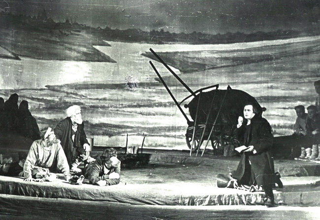 Драма-песня – так определили жанр постановки её авторы. Во всех девяти картинах обутые в лапти мужчины и женщины в холщовых рубашках и старинных сарафанах находятся на сцене, то смешиваясь с героями драмы, как в сценах народного гулянья, то отходят к кулисам, завершая песней какой-то эпизод. Одновременно на сцене постоянно присутствуют сто пятьдесят человек…