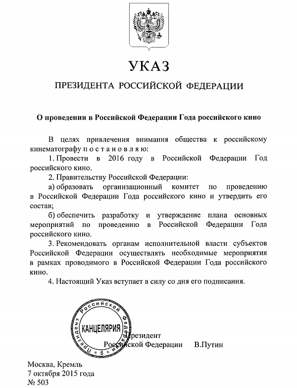 Президент России Владимир Путин подписал указ «О проведении в Российской Федерации года российского кино». Документ опубликован на официальном портале правовой информации. Таким образом, 2016 год пройдёт под знаком особого внимания к кинематографу.