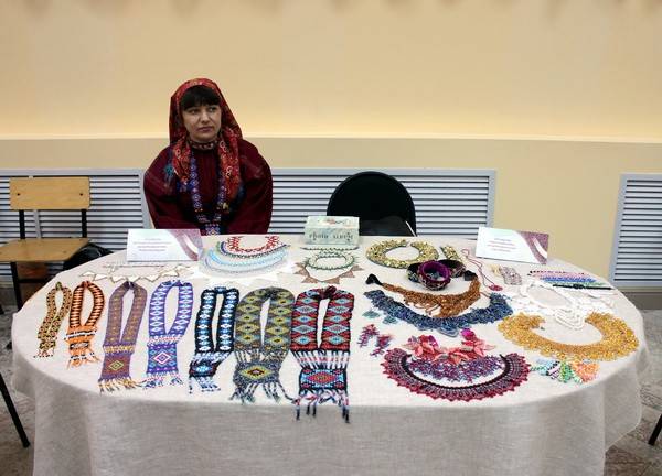 Перед началом конкурса внимание гостей занимала выставка аксессуаров и отдельных элементов традиционной русской одежды. Результаты своего творчества здесь представляли мастера бисероплетения, декоративной вышивки и вязания.