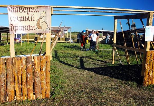 Главные люди на фестивале расположились, как ни странно, в самом конце поляны, символично замыкая ее. Здесь буквально на глазах, за считанные минуты из досок и деревянных брусков вырастает самая настоящая средневековая таверна «Сытый дракон», где проголодавшиеся участники и гости фестиваля могут подкрепиться блюдами, приготовленными прямо на костре.