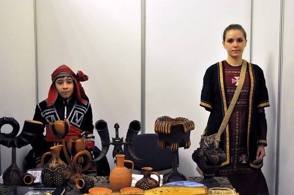 Перед концертом в фойе второго этажа Концертного зала была развёрнута выставка, подготовленная силами национальных общин. Они представили предметы, связанные с культурой и бытом своих народов. Гости фестиваля получили возможность ознакомиться с традиционным костюмом, ремёслами, литературным наследием. В этом году сюжетная линия областного фестиваля была связана со значимым общероссийским культурным событием – Годом Российского кино. Поэтому в рамках фестивальной экспозиции каждая из общин представила кроме традиционных элементов еще и информационные материалы о кинематографе своей исторической родины.