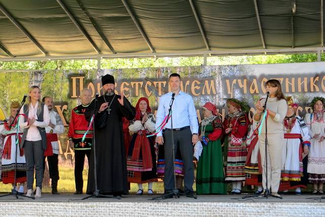 Второй день фестиваля начался с Троицкого торжественного молебна в храме Казанской иконы Божьей Матери и продолжился праздничным шествием фольклорных и этнографических коллективов по улицам села.