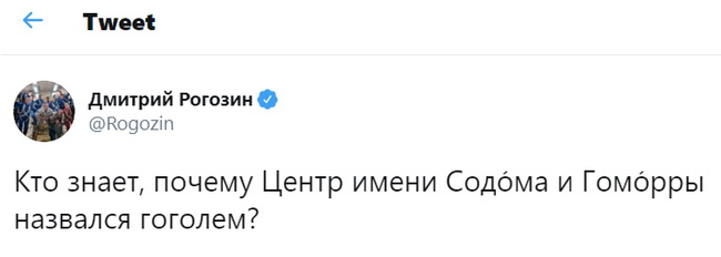 Руководитель «Роскосмоса» Дмитрий Рогозин, задался в «Твиттере» вопросом: «Кто знает, почему Центр имени Содома и Гоморры назвался гоголем?»