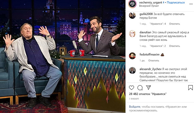 Телеведущий Иван Ургант, сам того не желая, попал в очень неприятную историю. Вечером 7 января телеэфире Первого канала Ургант и Жерар Депардье выдали несколько антихристианских шуток, чем навлекли на себя гнев православных активистов. Передача вышла в день, когда православные праздновали Рождество.
