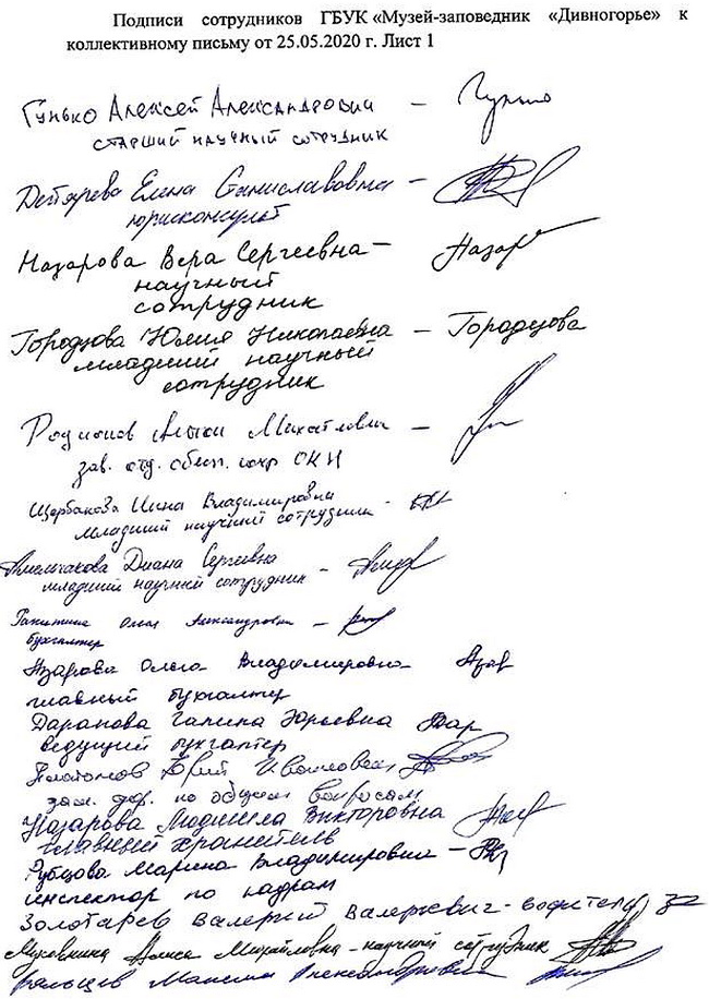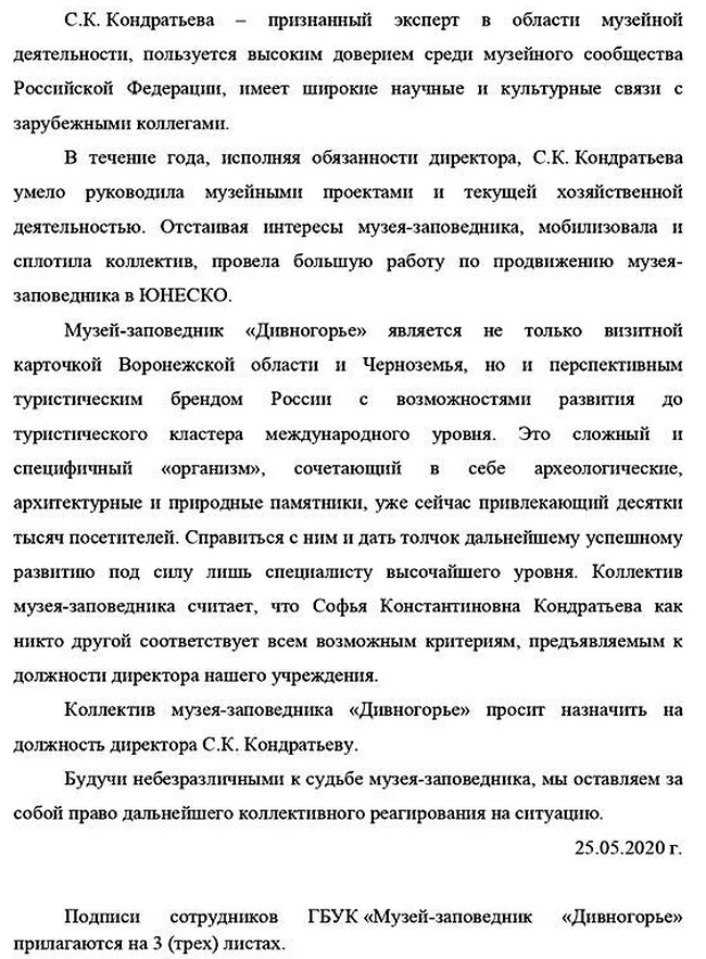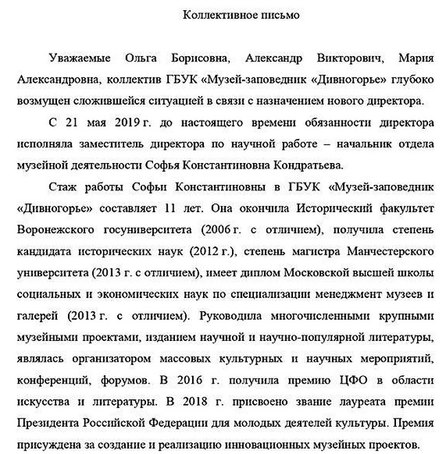 Однако Кондратьева отказалась, причём публично. На защиту Софьи Константиновны поднялся весь коллектив музея-заповедника. Сотрудники направили открытое письмо министру культуры России Ольге Любимовой, губернатору Александру Гусеву и главе департамента культуры региона Марии Мазур.