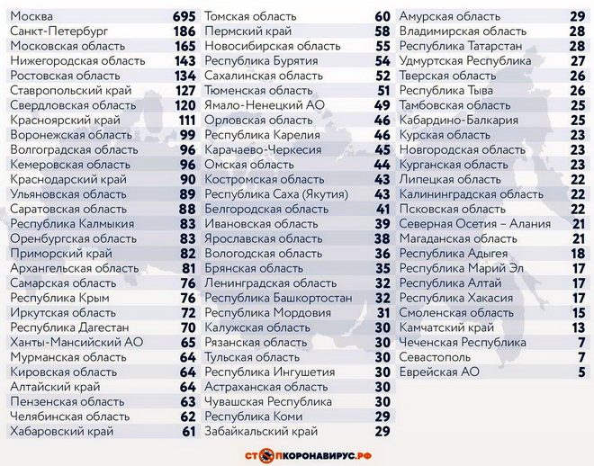 Регионы-лидеры по числу заболевших за последние сутки: Санкт-Петербург (186 случаев), Московская область (165), Нижегородская область (143), Ростовская область (134), Ставропольский край (127), Свердловская область (120), Красноярский край (111), Воронежская область (99).