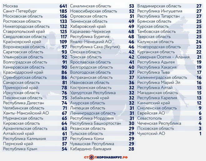 Регионы-лидеры по числу заболевших за последние сутки: Санкт-Петербург (185 случаев), Московская область (156), Нижегородская область (132), Республика Калмыкия (132), Ростовская область (133), Ставропольский край (125), Свердловская область (117), Красноярский край (109), Воронежская область (97).
