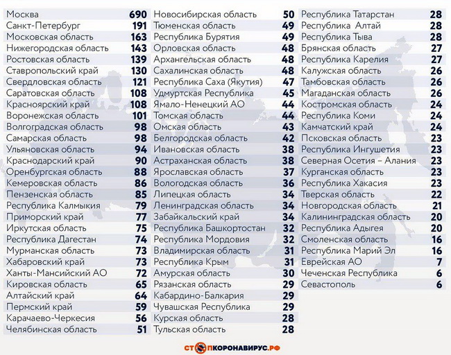 Регионы-лидеры по числу заболевших за последние сутки: Санкт-Петербург (191 случай), Московская область (163), Нижегородская область (143), Ростовская область (139), Ставропольский край (130), Свердловская область (121), Красноярский край (108), Саратовская область (108), Воронежская область (101).