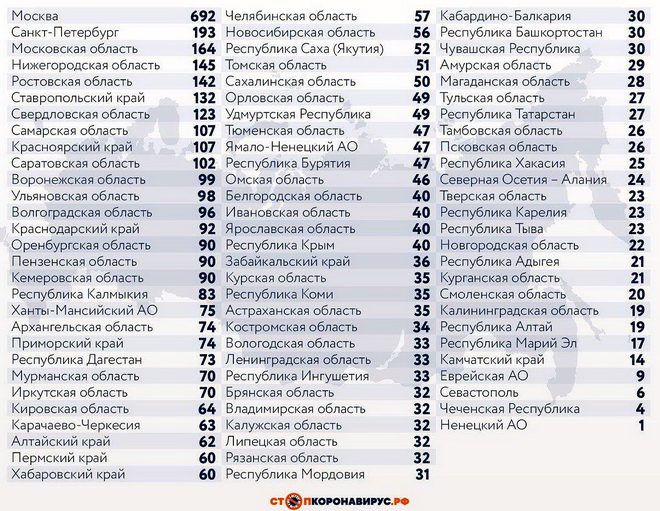 Регионы-лидеры по числу заболевших за последние сутки: Санкт-Петербург (193 случая), Московская область (164), Нижегородская область (145), Ростовская область (142), Ставропольский край (132), Свердловская область (123), Красноярский край (107), Самарская область (107), Саратовская область (102), Воронежская область (99).