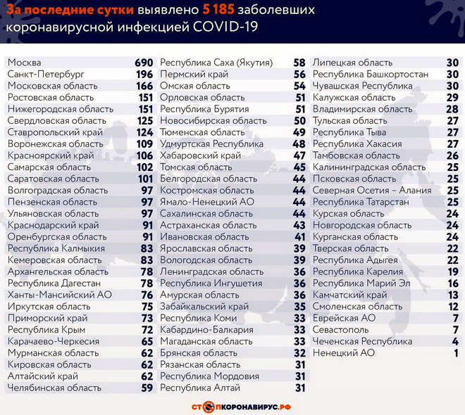 Федеральный оперативный штаб сообщил в понедельник о 5185 новых случаях заражения коронавирусной инфекцией в России (вчера было 5195). Общее число подтверждённых случаев Covid-19 в России достигло 1 030 690.