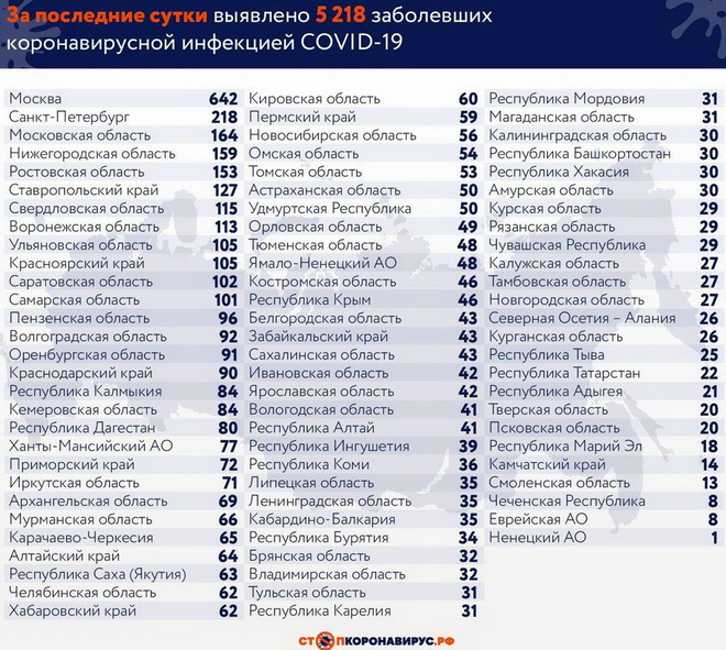 Регионы-лидеры по числу заболевших за последние сутки: Санкт-Петербург (218 случаев), Ростовская область (153), Нижегородская область (159), Московская область (164), Ставропольский край (127), Свердловская область (115), Воронежская область (113), Красноярский край (105), Ульяновская область (105), Саратовская область (102), Самарская область(101).