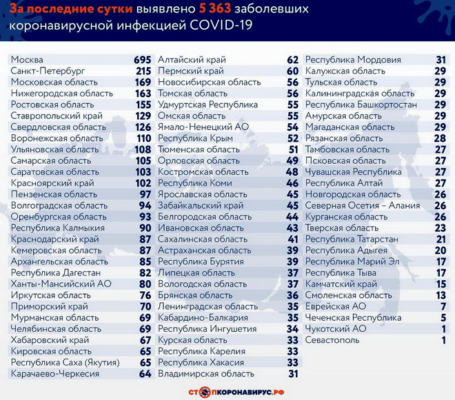 Регионы-лидеры по числу заболевших за последние сутки: Санкт-Петербург (215 случаев), Ростовская область (155), Нижегородская область (163), Московская область (169), Ставропольский край (129), Свердловская область (126), Воронежская область (110), Красноярский край (102), Ульяновская область (108), Саратовская область (103), Самарская область (105).