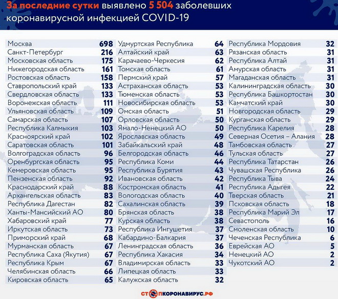 Федеральный оперштаб сообщил в пятницу о 5504 новых случаях заражения коронавирусной инфекцией в России (вчера было 5363). Общее число подтверждённых случаев Covid-19 в Российской Федерации достигло 1051874.