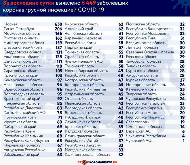 Регионы-лидеры по числу заболевших за последние сутки: Санкт-Петербург (206 случаев), Ростовская область (162), Нижегородская область (159), Московская область (166), Ставропольский край (137), Свердловская область (131), Воронежская область (110), Красноярский край (103), Ульяновская область (128), Саратовская область (105), Самарская область (111).