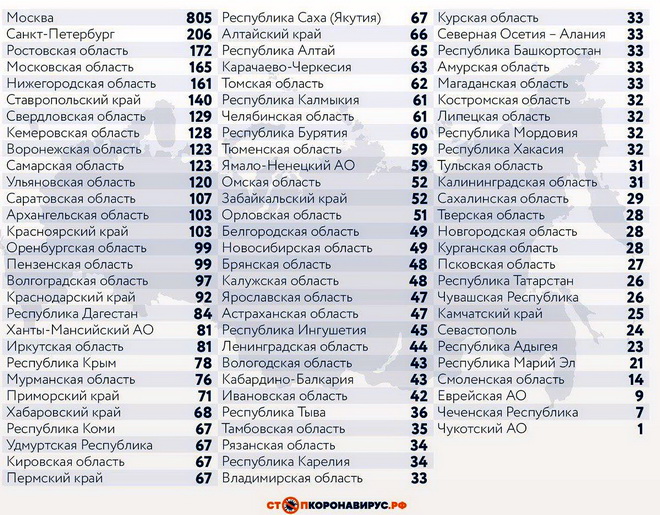 Регионы-лидеры по числу заболевших за последние сутки: Санкт-Петербург (206 случаев), Ростовская область (172), Нижегородская область (161), Московская область (165), Ставропольский край (140), Свердловская область (129), Воронежская область (123), Красноярский край (103), Ульяновская область (120), Саратовская область (107), Самарская область (123), Кемеровская область (128), Волгоградская область (97), Пензенская область (99), Оренбургская область (99), Архангельская область (103).