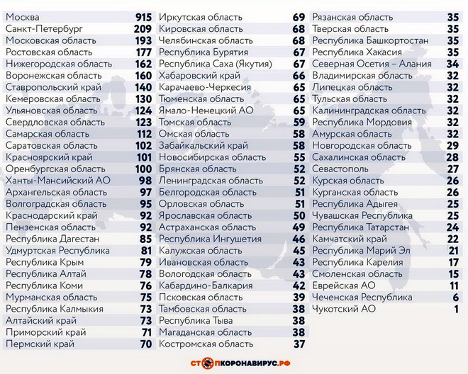 Регионы-лидеры по числу заболевших за последние сутки: Санкт-Петербург (209 случаев), Ростовская область (177), Нижегородская область (162), Московская область (193), Воронежская область (160), Ставропольский край (140), Свердловская область (123), Самарская область (112), Кемеровская область (130), Ульяновская область (124).