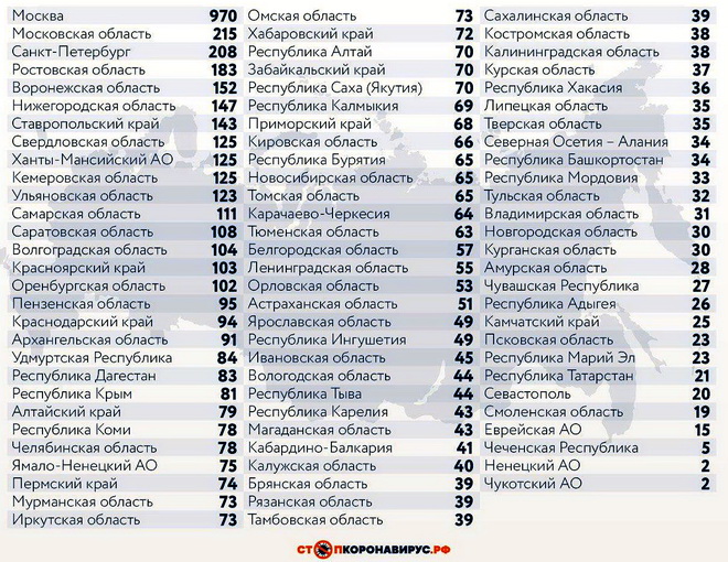 Регионы-лидеры по числу заболевших за последние сутки: Санкт-Петербург (208 случаев), Ростовская область (183), Нижегородская область (147), Московская область (215), Воронежская область (152), Ставропольский край (143), Свердловская область (125), Ханты-Мансийский АО (125), Самарская область (111), Кемеровская область (125), Ульяновская область (123).
