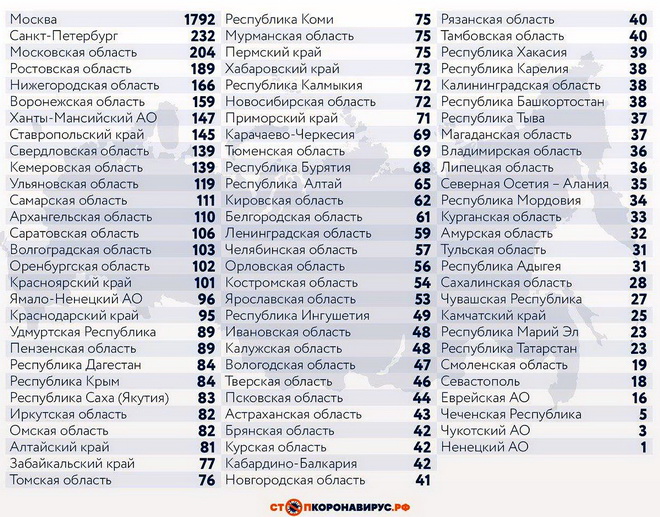 Регионы-лидеры по числу заболевших за последние сутки: Санкт-Петербург (232 случая), Ростовская область (189), Нижегородская область (166), Московская область (204), Воронежская область (159), Ставропольский край (145), Свердловская область (139), Ханты-Мансийский АО (147), Самарская область (111), Кемеровская область (139), Ульяновская область (119).