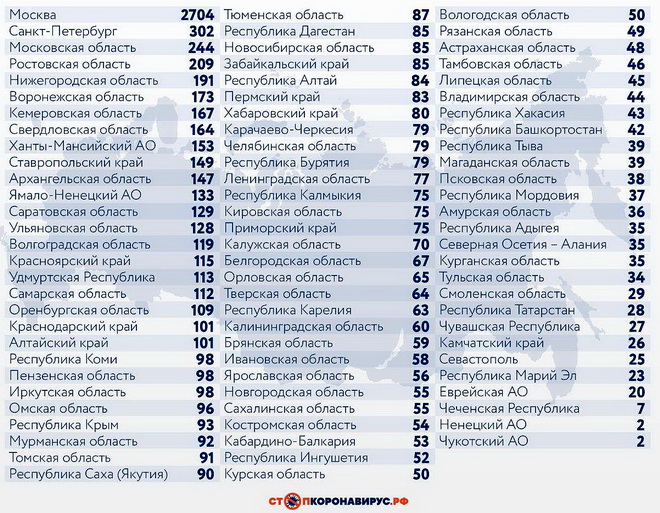 Регионы-лидеры по числу заболевших за последние сутки: Санкт-Петербург (302 случая), Ростовская область (209), Нижегородская область (191), Московская область (244), Воронежская область (173), Ставропольский край (149), Свердловская область (164), Ханты-Мансийский АО (153), Кемеровская область (167), Архангельская область (147).