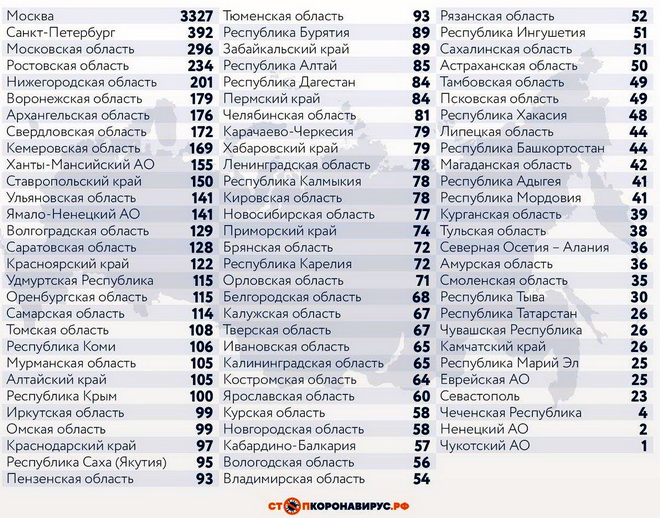Регионы-лидеры по числу заболевших за последние сутки: Санкт-Петербург (392 случая), Ростовская область (234), Нижегородская область (201), Московская область (296), Воронежская область (179), Ставропольский край (150), Свердловская область (172), Ханты-Мансийский АО (155), Кемеровская область (169), Архангельская область (176).