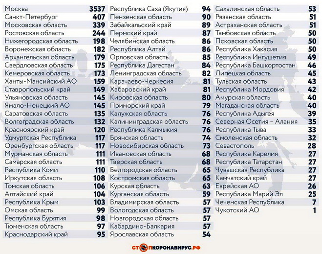 В списке субъектов РФ, лидирующих по числу заболевших за последние сутки: Санкт-Петербург (407 случаев), Московская область (339), Ростовская область (244), Нижегородская область (198), Воронежская область (182), Архангельская область (179), Свердловская область (175), Кемеровская область (173), Ханты-Мансийский АО (159) и Ставропольский край (149).