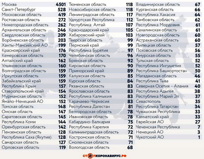 Также в списке субъектов РФ, лидирующих по суточному числу заболевших: Санкт-Петербург (528 случаев), Московская область (419), Ростовская область (272), Нижегородская область (262), Архангельская область (246), Свердловская область (209), Воронежская область (203), Ханты-Мансийский АО (199).