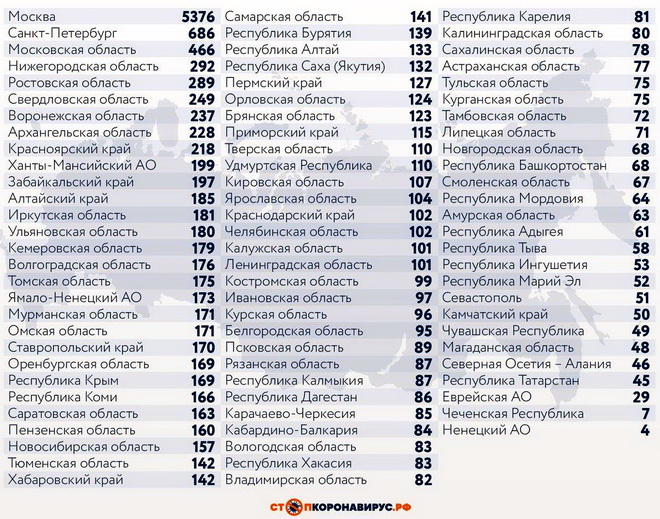 В перечне субъектов РФ, лидирующих по суточному числу заболевших: Санкт-Петербург (686 случаев), Московская область (466), Нижегородская область (292), Ростовская область (289), Свердловская область (249), Воронежская область (237), Архангельская область (228), Красноярский край (218), Ханты-Мансийский АО (199).