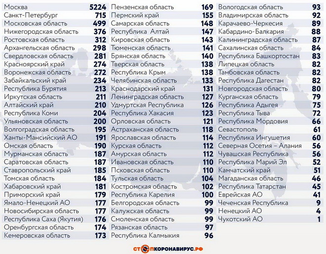 В перечне субъектов РФ, лидирующих по суточному числу заболевших: Санкт-Петербург (715 случаев), Московская область (499), Нижегородская область (376), Ростовская область (312), Архангельская область (298), Свердловская область (281), Красноярский край (274), Воронежская область (272).