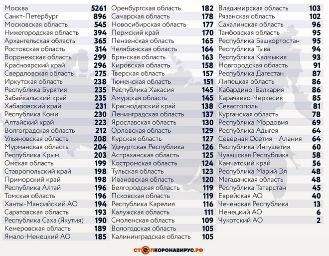 В перечне субъектов Российской Федерации, лидирующих по суточному числу заболевших: Санкт-Петербург (896 случаев), Московская область (545), Нижегородская область (394), Архангельская область (365), Ростовская область (314), Воронежская область (299), Красноярский край (296), Свердловская область (275).