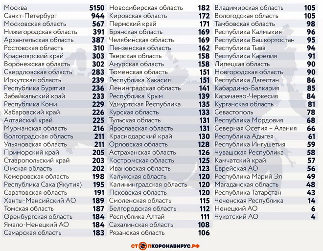 В перечне субъектов Российской Федерации, лидирующих по суточному числу заболевших: Санкт-Петербург (944 случая), Московская область (567), Нижегородская область (391), Архангельская область (387), Ростовская область (310), Красноярский край (303), Воронежская область (302), Свердловская область (283).