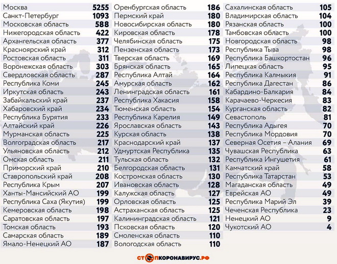 В перечне субъектов Российской Федерации, лидирующих по суточному числу заболевших: Санкт-Петербург (1093 случая), Московская область (588), Нижегородская область (422), Архангельская область (377), Красноярский край (312), Ростовская область (311), Воронежская область (303), Свердловская область (287).