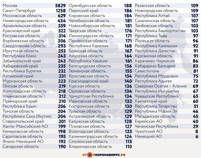 В перечне субъектов Российской Федерации, лидирующих по суточному числу заболевших: Санкт-Петербург (1258 случаев), Московская область (629), Нижегородская область (434), Архангельская область (359), Красноярский край (322), Ростовская область (314), Воронежская область (306), Свердловская область (293).