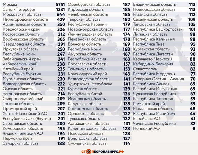 В перечне субъектов Российской Федерации, лидирующих по суточному числу заболевших: Санкт-Петербург (1331 случай), Московская область (644), Нижегородская область (429), Архангельская область (350), Красноярский край (326), Ростовская область (312), Воронежская область (305), Свердловская область (291).
