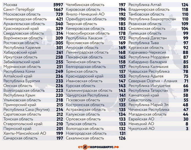 Среди субъектов Российской Федерации, лидирующих по числу заболевших за сутки: Санкт-Петербург (1667 случаев), Московская область (729), Нижегородская область (421), Архангельская область (340), Красноярский край (329), Свердловская область (314), Воронежская область (309), Ростовская область (305), Республика Карелия (301).